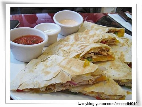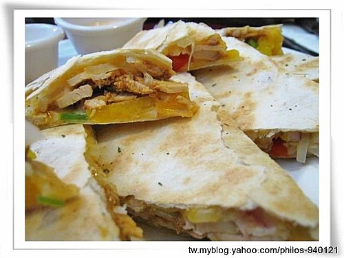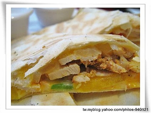 煎得香脆的餅皮內包著雞肉、甜椒、墨西哥飯等食材