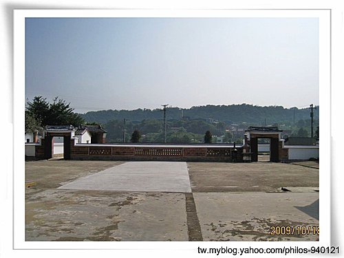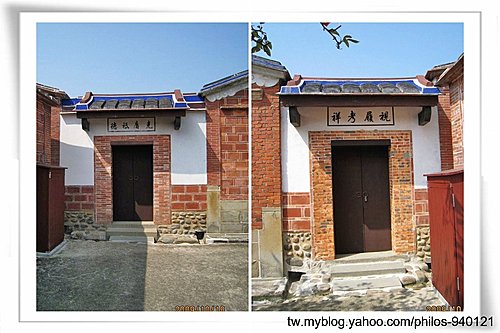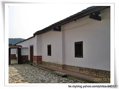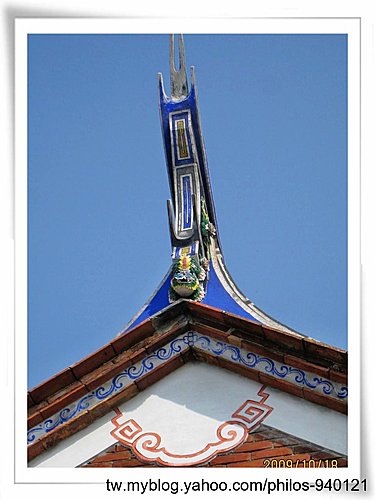 寶藍色線條點綴於屋頂、圍牆四周,是一典型紹安客家建築~