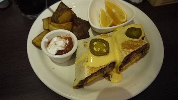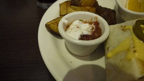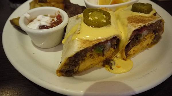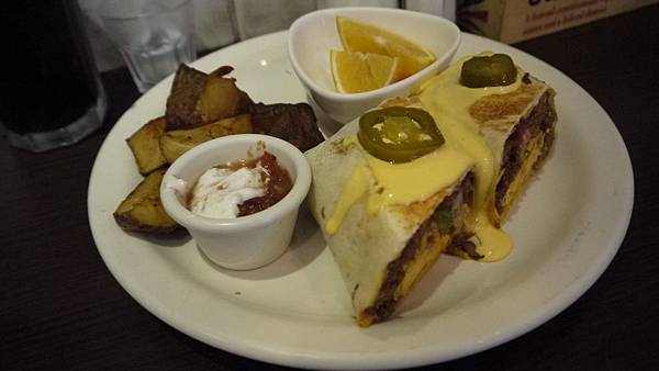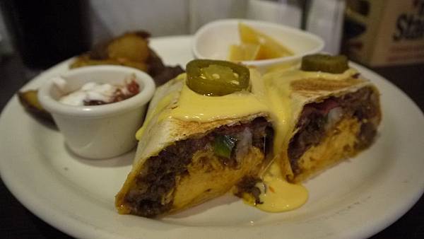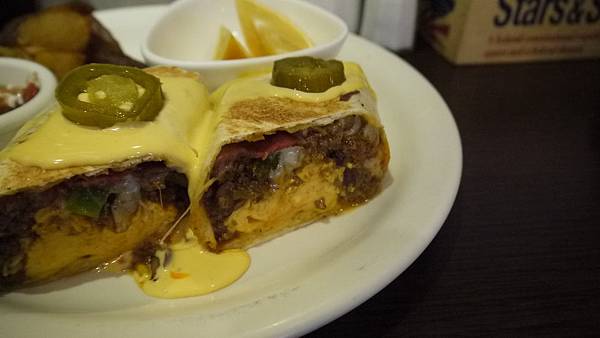 墨西哥辣牛肉醬、炒蛋、培根、青紅椒丁、洋蔥及起司